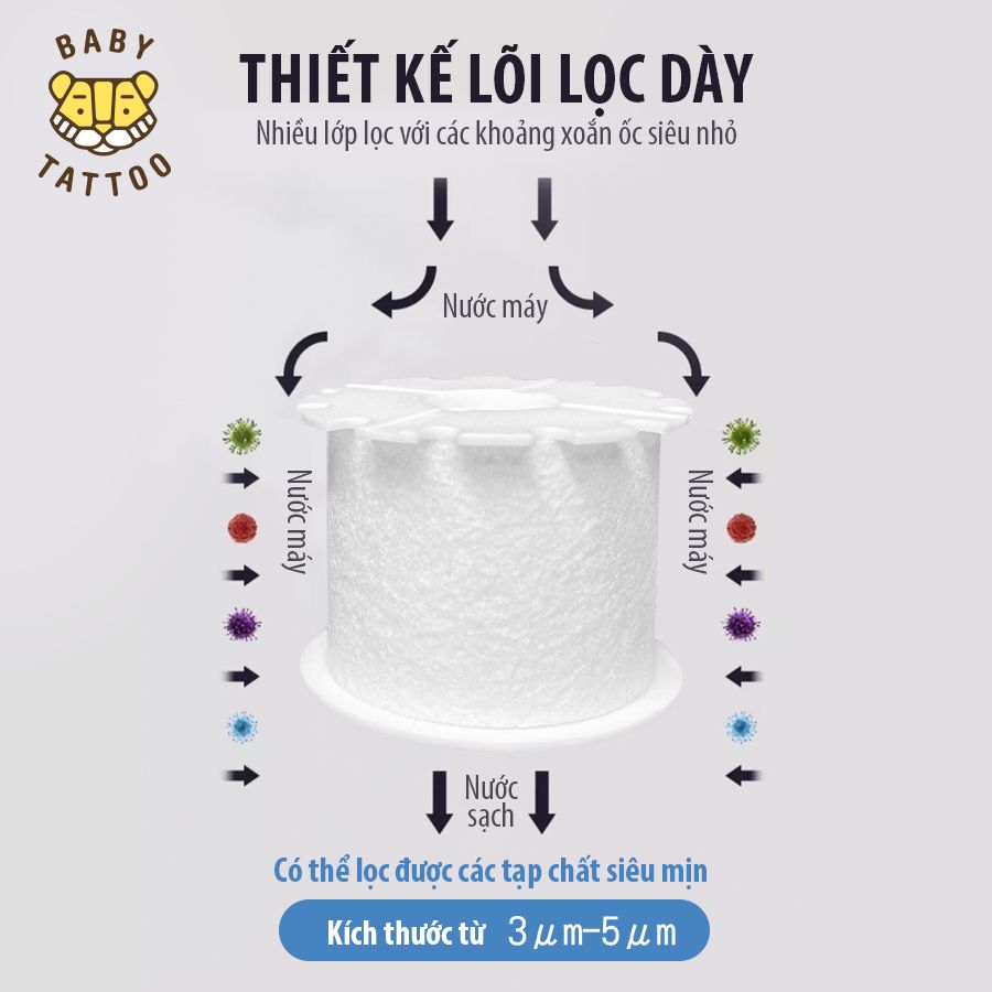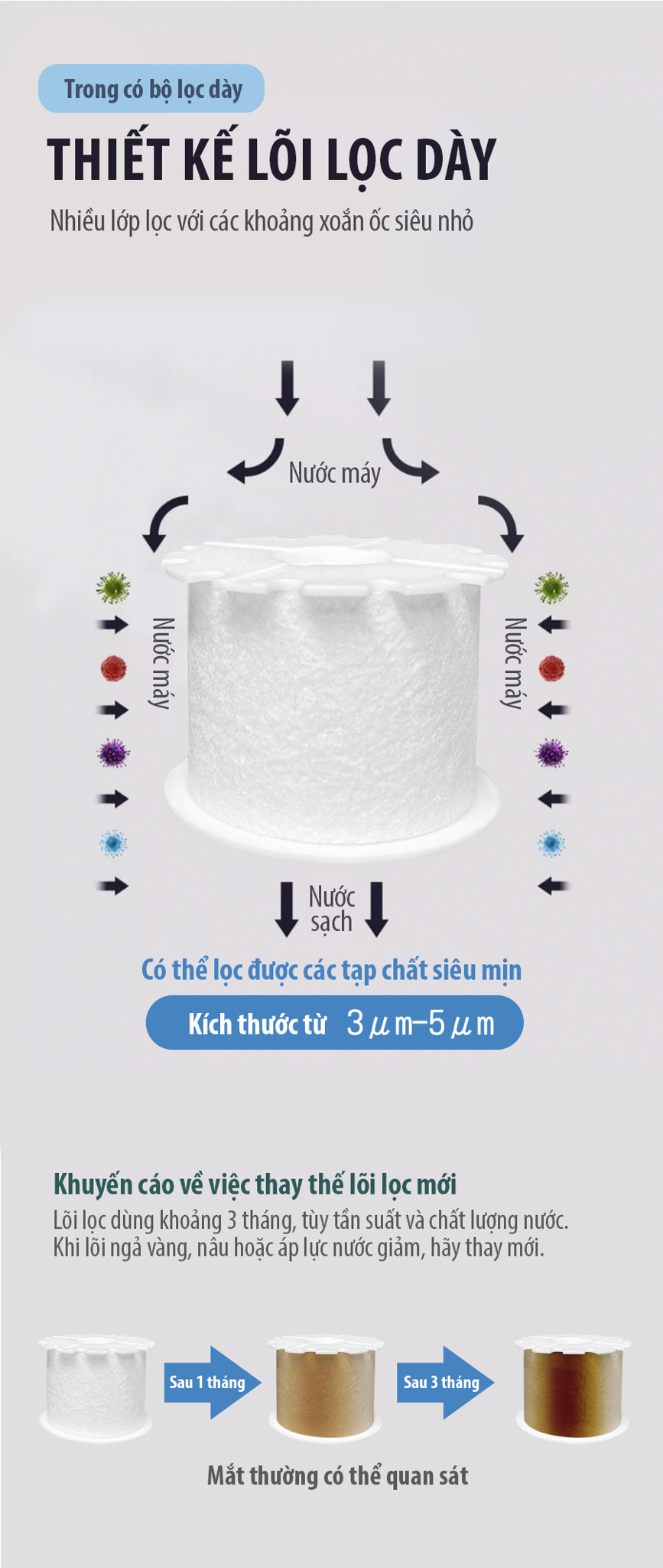 Thiết kế lõi lọc dày có nhiều lớp lọc với các khoảng tróng xoắn ốc siêu nhỏ