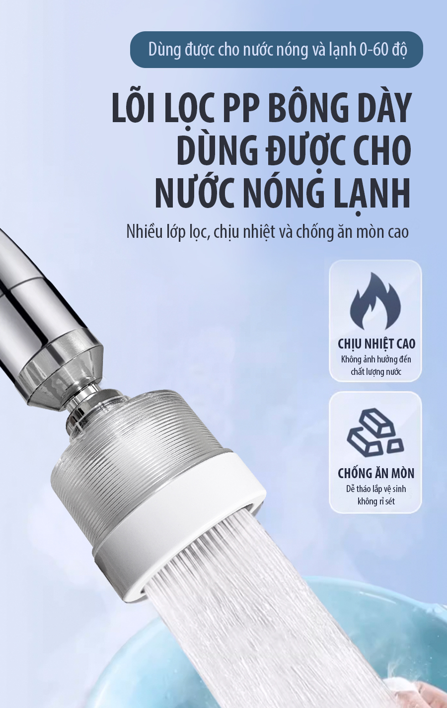 Sử dụng cho nước nóng lạnh từ 0-60 độ